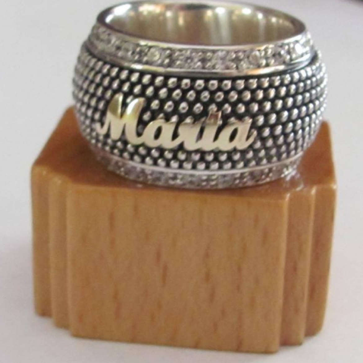 Anel em Ouro de 9k com Prata e zircónias : Com 1 Nome. Tem 14mm de largura.