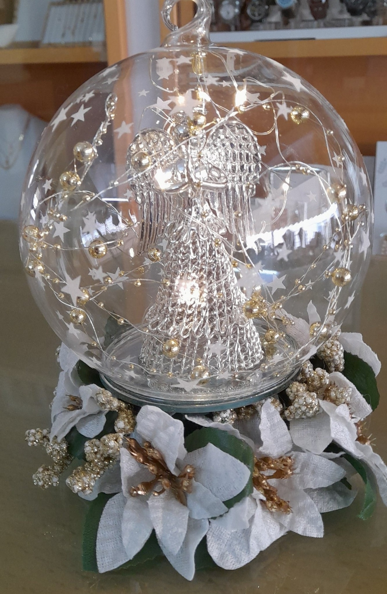 • Bola com Anjo em Prata e luz LED